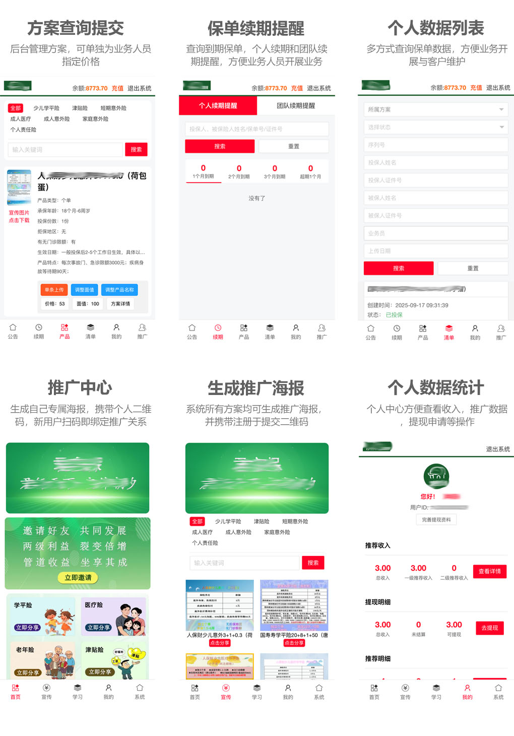 专属二维码赋能推广:每个注册推广人员自动生成 2 类专属二维码 ——「推广码」用于邀请新伙伴,「投保码」直接关联客户保单,谁推广、谁成交,一码溯源。